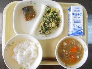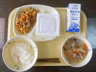 今日の給食は、地産地消ウィークで、ご飯、牛乳、県産納豆、切干大根の煮物、豆乳仕立ての野菜汁です。高根沢町で生産された物は、とうにゅう、みそ、にんじん、しいたけ、まいたけ、たまねぎ、だいこん、ねぎ、こめ、さつまいもです。今日もたいへんおいしく頂きました。