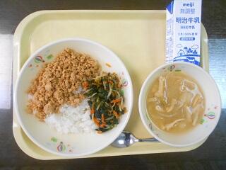 今日の給食は、地産地消ウィークで、牛丼(ご飯・牛丼の具)、牛乳、ほうれん草のナムル、なめこ汁です。高根沢町で生産された物は、とうふ、みそ、にんじん、なめこ、ねぎ、こめです。今日もたいへんおいしく頂きました。