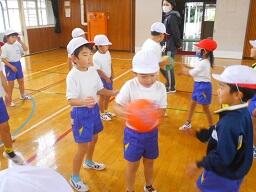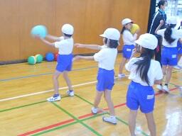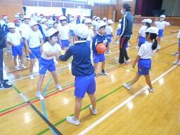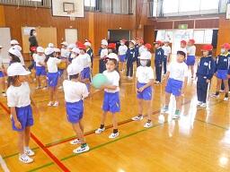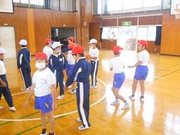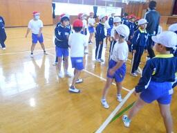 今日の2時間目に、1、2年生の合同体育の授業を見てきました。「体ほぐしの運動」で、ボールを使ってリレー形式で楽しく活動していました。