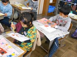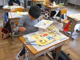 今日の1時間目に、1年生の図工の授業を見てきました。「いろいろな かみの かたちから」という教材で、まずは紙を切ったりちぎったりして、その形から何ができるかを考え台紙に貼り付けていました。みんなとても面白い作品になってきていました。