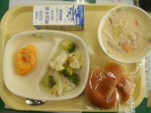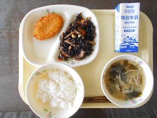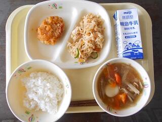 今日の給食は、ご飯、牛乳、メンチカツ、ポテトサラダ、なめこ汁です。高根沢町で生産された物は、とうふ、みそ、にんじん、たまねぎ、なまこ、ねぎ、こめです。今日もたいへんおいしく頂きました。