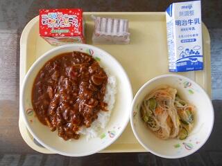 今年最後の給食は、みんなが食べられるメニューで、ご飯、ハートカレー、花野菜とハートパスタのサラダ、牛乳または、ほうじ茶です。高根沢町で生産された物は、たまねぎ、こめです。今日もたいへんおいしく頂きました。