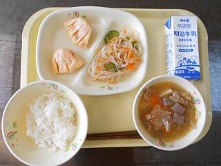 今日の給食は、ご飯、牛乳、いかのチリソースがけ、ブロッコリーとしめじのサラダ、鶏団子汁です。高根沢町で生産された物は、にんじん、ねぎ、しいたけ、だいこん、こめです。今日もたいへんおいしく頂きました。