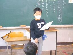 今日の1時間目に、2年生の国語の授業を見てきました。「冬いっぱい」という単元で、冬で自分が感じたことを書いたカードを発表していました。霜柱、氷、なべ・・・など、みんなとてもいいことを感じていました。