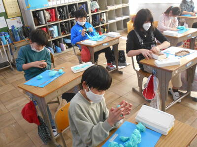 3年生は図工。粘土の作品が完成した人から、先生に写真を撮ってもらっています。