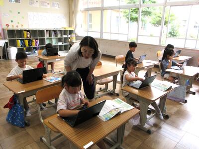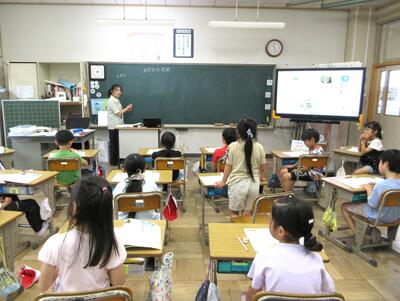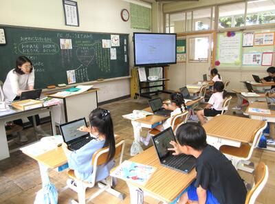1年生は、身の回りでお世話になっている人について、考えました。タブレットを使って、自分の考えを先生に伝えています。