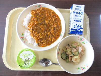 今日の献立は「麦ご飯、牛乳、大豆ミート入りひき肉カレー、キャベツとツナのサラダ、マスカットゼリー」です。おいしくいただきました。