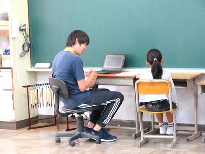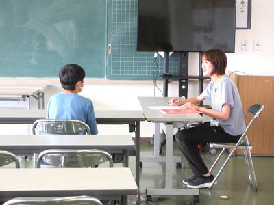 担任と児童が1対1で話します。一人一人、児童ががんばっていることを伝えたり、不安や困っていることなどの相談にのったりしています。