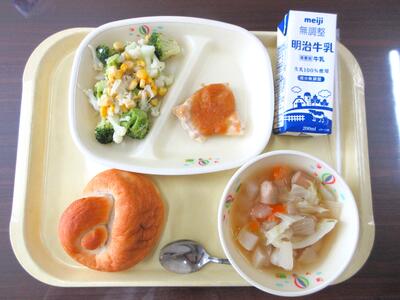 今日の献立は「米粉パン、牛乳、鶏肉のバーベキューソースがけ、はなやさいサラダ、ポトフ」です。おいしくいただきました。
