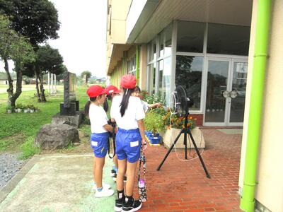 1年生の生活科では、2回目の秋の虫探しをしています。捕まえたトンボを観察しています。