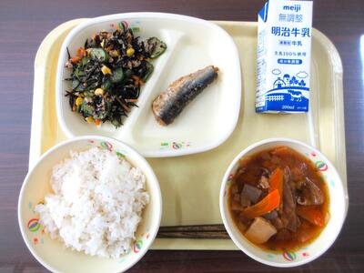 今日の献立は「麦ご飯、牛乳、いわしごま味噌煮、ひじきとツナのサラダ、豚汁」です。おいしくいただきました。