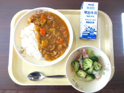 今日の献立は「ご飯、牛乳、ポークカレー、サラミソーセージとブロッコリーのサラダ」です。おいしくいただきました。
