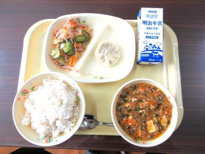 今日の献立は「麦ご飯、牛乳、マーボー豆腐、ねぎまんじゅう、春雨のサラダ」です。おいしくいただきました。