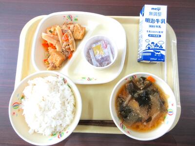 今日の献立は「ご飯、牛乳、納豆、厚揚げのピリ辛炒め、大根とワカメのみそ汁」です。おいしくいただきました。
