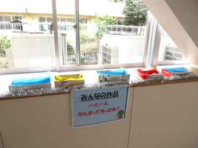 今回は、2年生の図画工作「でこぼこ はっけん!」の作品です。管理棟1階会議室前の特設コーナーにあります。