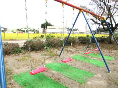 また、ブランコの下の地面には、用務員さんが砂を敷き、人工芝を設置しました。今までは、雨上がりにはいつも大きな水たまりができ、子どもたちはブランコに乗れませんでした。今は、この緑色の人工芝のおかげで水にぬれることなくブランコを楽しむことができます。