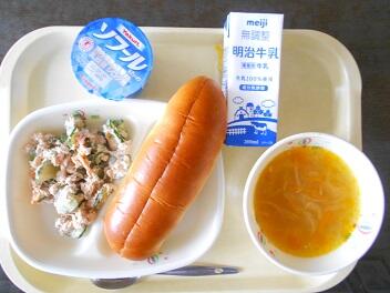 今日の給食は、はちみつパン、牛乳、ツナサラダ、チキンオニオンスープ、ヨーグルトです。高根沢町で生産された物は、きゅうり、たまねぎです。今日もたいへんおいしく頂きました。