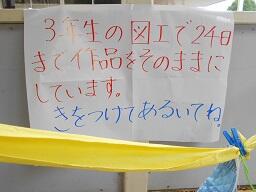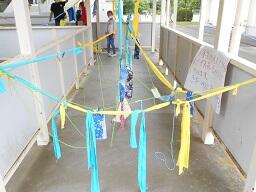 3年生の図工の「布をつなげて」という単元で、それぞれのグループでテントやアスレチック等のイメージを膨らませ、いろいろな布やひも、洗濯ばさみなどを使って自分たちがイメージした作品を仕上げ、体育館通路に飾りました。みんな苦労して作り上げた作品はなかなかの物が出来上がっています。よく頑張りました、3年生。