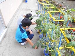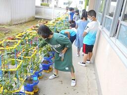 朝の1、2年生は、生活科で自分で育てている、あさがおと野菜の世話をしています。2年生の教室前では、トマトを収穫した子がいました。みんな自分のあさがおや野菜をとても大切に育てています。これからどんな花が咲き、どんな実がなるのかとても楽しみです。たくさんなったミニトマトの実を、ドレミファソラシドと数えている2年生がいました。すごい発想だと思いました。