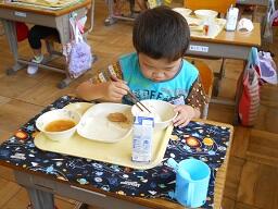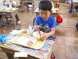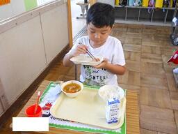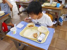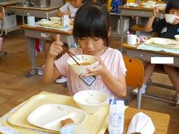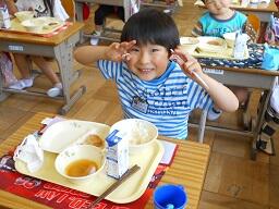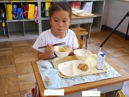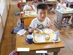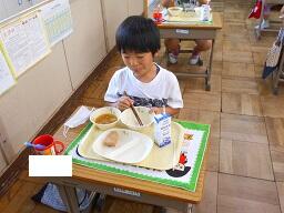 今日の給食は、ご飯、牛乳、とりにくのごまみそやき、ピリからみそしるです。高根沢町で生産された物は、みそ、こめです。今日もおいしく頂きました。今日は、1年生が欠席0なので、全員の給食の様子をお知らせします。みんなおいしそうに食べていました。