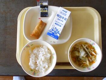 今日の給食は、むぎごはん、牛乳、はるまき、くきわかめのちゅうかスープ、のりのつくだにです。高根沢町で生産された物は、しいたけ、こめです。今日もたいへんおいしく頂きました。