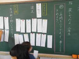 今日の1時間目に、3年生の国語の授業を見てきました。今日は、「楽しかったよ 2年生」の単元で、1年間をふりかえって、書くことを決める授業が展開されていました。2年生の時の1年間をふりかえり、短冊にいろいろ楽しかったことを書いて、黒板に貼っていました。みんなとても意欲的に取り組んでいました。