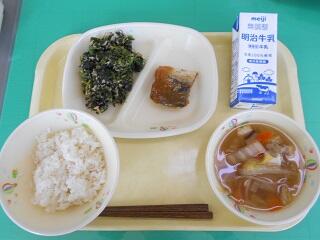 今日の給食は、阿久津中学校で総合的な学習の時間につくった献立で、麦ご飯、牛乳、さば味噌煮、ツナのり酢和え、きのこスープ、グレープゼリーです。高根沢町で生産されたものは、とうふ、まいたけ、しいたけ、ねぎ、こめです。今日もたいへんおいしく頂きました。