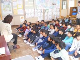 今日の給食の時間に、1年生が学校栄養士さんを招いて食に関する指導で「食事のマナー」について学びました。給食の準備や片付けについての話、「いただきます」と「ごちそうさま」の意味に関する紙芝居、そして「食事のマナー」についてのクイズなどが行われました。子どもたちは、給食を食べながら、真剣に話を聞いていました。