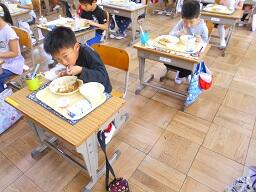 今日の給食は、コッペパン、牛乳、アンサンブルエッグ、ポークビーンズです。4月8日以来の給食、1年生にとっては初めての給食、たいへんおいしく頂きました。1年生は初めての給食でしたが、とても上手に配膳して食べることができていました。教育長さんが1年生の初めての給食を見に来て、たいへんほめて帰られました。本校の子どもたちがほめられるのは、校長としてとても気持ちのいいものです。