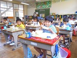 今日は、1年生2日目の給食です。今日のメニューは、紹介したとおり子どもたちに人気の高いチキンカレーということもあり、残す児童があまりいませんでした。デザートにはさくらゼリーもついたので、子どもたちは満足顔で食べていました。