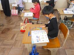 今日の2時間目に、1年生の算数の授業を見てきました。色板を使い、教科書と同じ魚やロケットの形を作っていましたが、みんな真剣に考えながら作業を進めていました。