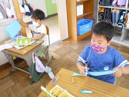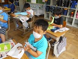 今日の3時間目に、1年生の図工の授業も見てきました。「やぶいた かたちから うまれたよ」の単元で、折り紙や新聞紙、画用紙をいろいろな形に破いて、それを台紙に貼り付けて思い思いの絵や模様を仕上げていました。みんな真剣な表情で破いたり貼ったりしているのがとても印象的でした。(今日は残念ながら1人欠席なので22名です。早く元気になって学校へ登校してきてください。)