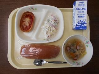 今年度最初の給食は、はちみつパン、牛乳、トマトグラタン、シルバーサラダ、やさいとウインナーのスープです。今日の給食で高根沢町で生産されたものは、キャベツです。今日もたいへんおいしく頂きました。
