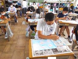 今日の2時間目に、6年生の図工の授業を少しだけ見てきました。「想像のつばさを広げて」という単元で、楽しいことや不思議なことを想像して絵に表すという活動をやっていました。ほとんどの児童が完成していましたが、みんないろいろなことを想像して表現していました。