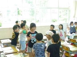 昼休みの後の中央タイムに実施しました。縦割り班ごとに、中央の森に