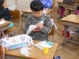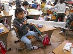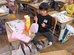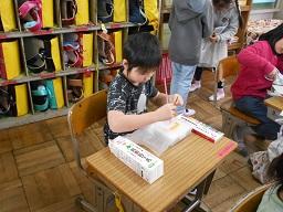 今日の3時間目に、1年生の図工の授業も見て来ました。「でてくるものをかんがえて、たのしいおもちゃをつくろう」というめあてで、ストローやふくろ、そしてそれを入れる箱を使って、楽しそうなおもちゃづくりに取り組んでいました。箱を切ったり、ストローをふくろに貼り付けたりと、なかなか悪戦苦闘していましたが、とても楽しそうに取り組んでいました。