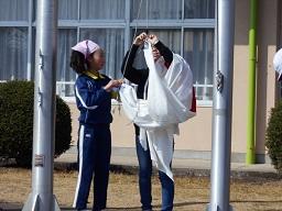 今日の昼休みに、今まで6年生が毎日やってきた国旗当番の引継式が行われました。6年生から国旗の揚げ方、降ろし方を教わった5年生が、来週から国旗当番になります。6年生の皆さん、今まで本当にありがとうございました。5年生の皆さん、これからよろしくお願いします。