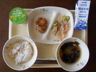 今日の給食は、むぎごはん、牛乳、チキンソテー、はるさめサラダ、とうふとわかめのみそしる、ヨーグルトです。本日の給食で高根沢町で生産されたものは、とうふ、みそ、にんじん、ねぎ、こめです。今日もおいしく頂きました。