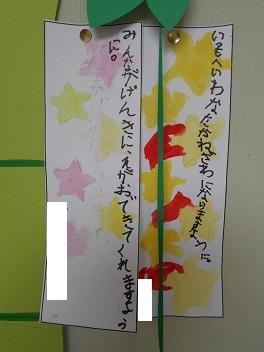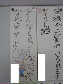 3年生の教室前廊下に、七夕のたんざくが飾ってありす。子どもたちそれぞれの願いごとが書いてありますが、どのたんざくもとてもよいことが書いてあります。この願いごとが叶ういいなと思いながら、全員のたんざくを読んできました。その中で、家族のこと、友だちのことが書かれた2人のたんざくがちょっと目にとまったので紹介します。明日の授業参観の時に、見て頂ければと思います。