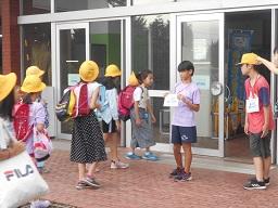 今日から9月6日(金)まで、児童会が中心となり、校内あいさつ運動が実施されます。これは、あいさつあふれる中央小学校を目指して、児童会が計画し実施しています。今日は、6年生と1年生があいさつボランティアの名札をつけ昇降口前に立って、大きな声であいさつをしていました。
