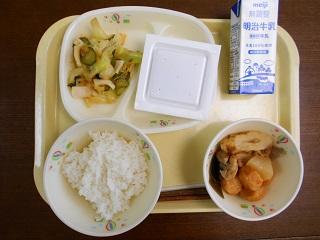 今日の給食は、ごはん、牛乳、なっとう、かんぴょうごまあえ、おでんです。高根沢町で生産されたものは、にんじん、だいこん、こめです。今日も、たいへんおいしく頂きました。