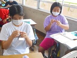 今日の1~2時間目に、5年生の家庭科の授業も見てきました。糸通しから玉結び、そしてなみ縫い、最後に玉どめの練習をしていました。家庭やクラブ活動ででやったことがある児童もいるようですが、みんな結構上手にできようになっていました。