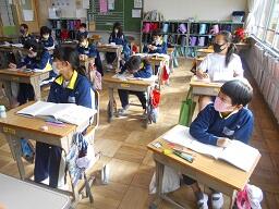 今日の3時間目に、4年生の外国語活動の授業を見てきました。1日の生活を絵と英語で表す絵本を作って、それを発表していました。発表するのはなかなか難しいようでしたが、みんながんばって取り組んでいました。