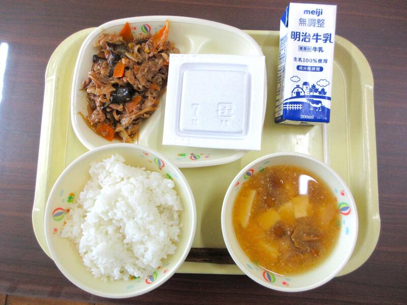 今日の献立は「ご飯、牛乳、県内産納豆、豚肉と野菜の味噌炒め、なめこ汁」です。地産地消ウィークで、県内産の納豆の他に、町内産の食材として、米(コシヒカリ)、味噌、豆腐、きくらげ、キャベツ、なめこ、ねぎが使われています。おいしくいただきました。