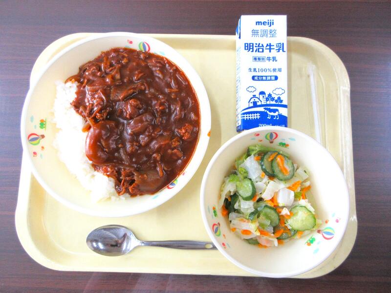 今日の献立は「ご飯、牛乳、ハッシュドポーク、フレンチサラダ」です。地産地消ウィーク最終日です。町内産の食材として、米(コシヒカリ)、舞茸、玉ねぎ、きゅうり、キャベツが使われています。おいしくいただきました。