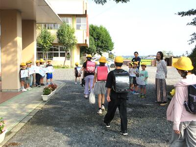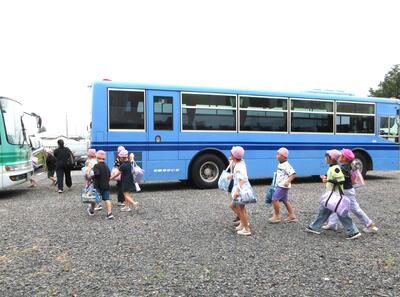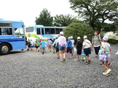 1年生・2年生・3年生と5年生が町外の施設に水泳学習に出発です。