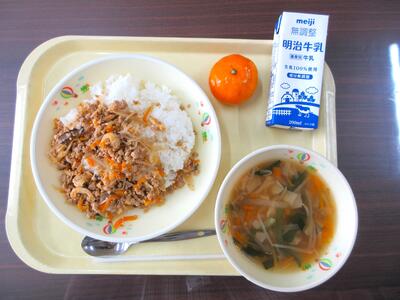 今日の献立は「和風ビビンバ丼、牛乳、ワンタンスープ、冷凍みかん」です。おいしくいただきました。