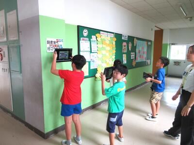 2年生の国語では、学校の中で「情報を伝えているもの」を探して、タブレットで写真に撮っています。