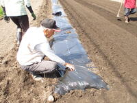 本日、ボランティアの方のお力で畑をきれいにし、作物を植えるために畝を立てたりマルチを張ったりしました。