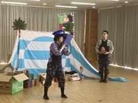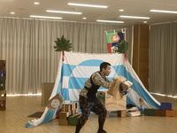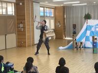 「風の子ぴーぷーぴーふゃら団」という演目の公演でした。あらすじは、ぴーぷー団が作った秘密基地にぴーふゃら団が攻めてきて遊んで帰っていくとういものですが、その遊びとは、コマや紙風船、けん玉、紙芝居、おもちゃ遊び等、昔懐かしい遊びでした。劇団の方の上手な遊びにビックリしながら子どもたちは、夢中になって劇に見入っていました。現在は、ゲームで遊ぶことが多いと思いますが、皆で一緒になって遊んだ昔の遊びに興味をもったのではないでしょうか。